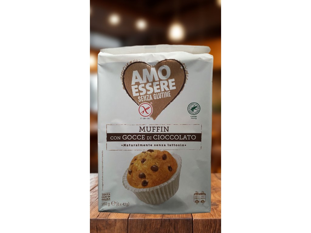 Dokonalé italské muffiny s kousky čokolády bez lepku i bez laktózy! Značka Amo Essere Gluten-free je řada určená přímo pro celiaky, přesto naprosto plná chuti. Dopřejte sobě i svým dětem sladkou svačinku